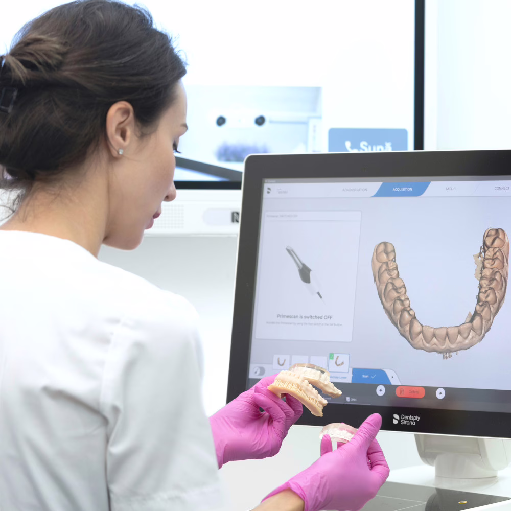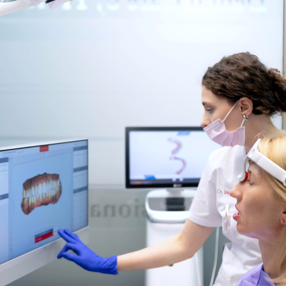 - scanare intraorală – înlocuiește amprenta clasică și oferă un model 3D al dinților;